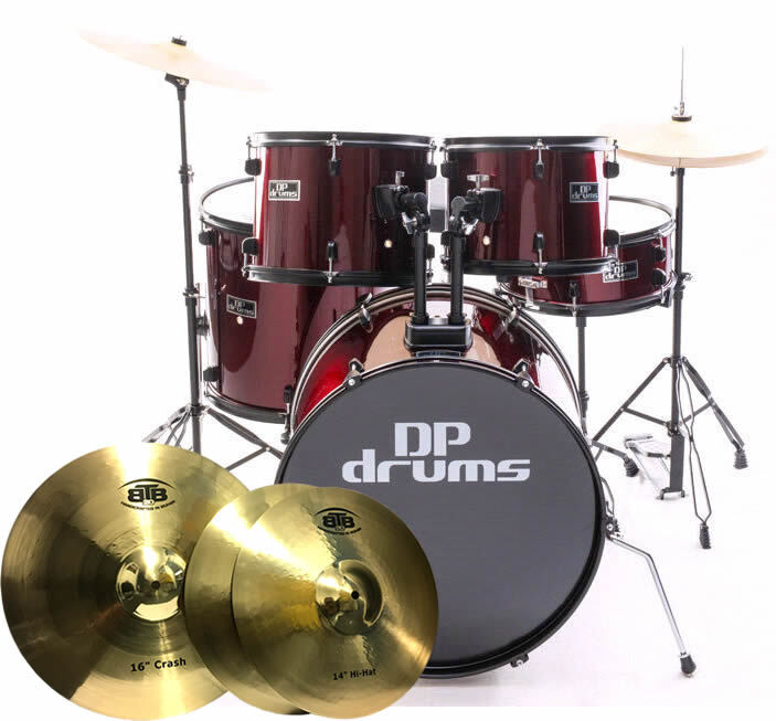 DP DRUMS STARTER PLUS 5 PIECE FULL SIZE DRUM KIT PACKAGE INCLUDING BTB20 CYMBAL UPGRADE PACK - 14" HI HATS, 16" CRASH, STOOL & DOUBLE BRACED HARDWARE - WINE RED - 2 YEAR WARRANTY