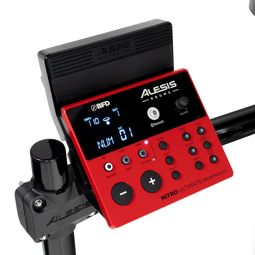 Designed for drummers at any stage and skill level, the Alesis Nitro Ultimate delivers high-quality sound, real-feel response, and modern functionality. Built to be played comfortably in bedrooms and small spaces, this nine-piece electronic kit immerses you in an organic playing experience without the volume of acoustic drums.