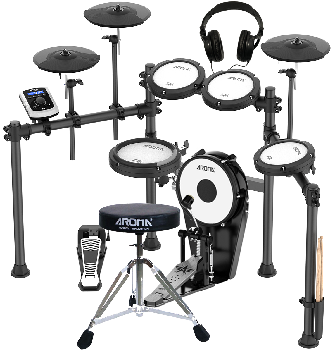 The Aroma TDX-22II 8 piece electronic drum kit consists of 5 drums and 3 cymbals in a mesh head configuration and includes bluetooth function and Smart App connection for phone, tablet and other smart devices. Mesh heads are the overwhelming preference of drummers when they play electronic drum kits because of their natural feel and ultra-quiet response.