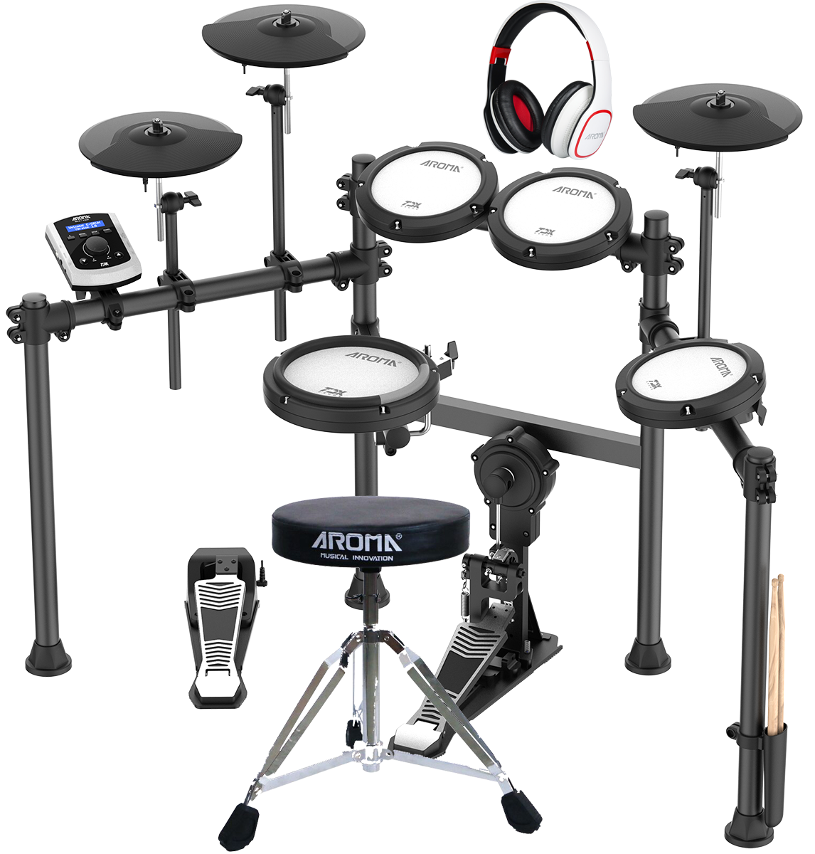 The Aroma TDX-22II 8 piece electronic drum kit consists of 5 drums and 3 cymbals in a mesh head configuration and includes bluetooth function and Smart App connection for phone, tablet and other smart devices. Mesh heads are the overwhelming preference of drummers when they play electronic drum kits because of their natural feel and ultra-quiet response.