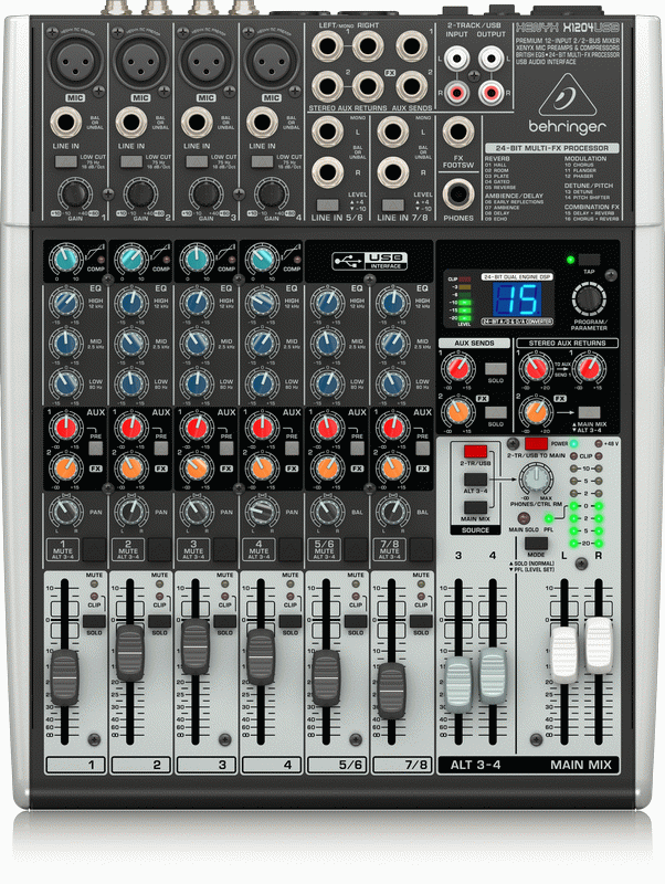 The compact X1204USB mixer allows you to effortlessly achieve premium-quality sound, thanks to 4 onboard studio-grade XENYX Mic Preamps and ultra-musical British channel EQs. And our easy-to-use one-knob compressors provide total dynamic control for the ultimate in punch and clarity, while respecting all the power and emotion you pack into every note. Add to this our 24-bit, dual engine Multi-FX processor with 16 editable, professional-grade presets including reverb, chorus, flanger, delay, pitch shifter and multi-effects  and the X1204USB becomes an incredibly versatile mixer for your live performances. But the X1204USB wasnt just designed to handle your live gigs; it also provides the state-of-the-art tools you need to make stunning, professional-quality recordings. Along with a built-in USB/audio interface, the XENYX X1204USB comes with all the recording and editing software needed to turn your computer into a complete, high-performance home recording studio.  Premium ultra-low noise, high headroom analog mixer  4 state-of-the-art, phantom-powered XENYX Mic Preamps comparable to stand-alone boutique preamps  4 studio-grade compressors with super-easy "one-knob" functionality and control LED for professional vocal and instrumental sound  Neo-classic "British" 3-band EQs for warm and musical sound  New studio-grade FX processor with 16 editable presets including reverb, chorus, flanger, delay, pitch shifter, multi-effects, Tap function and storable user parameter settings  Built-in stereo USB/Audio Interface to connect directly to your computer. Free audio recording, editing and podcasting software plus 150 instrument/effect plug-ins and ultra-low latency driver downloadable at www.behringer.com  2 aux sends per channel: 1 pre/post fader switchable for monitoring/FX applications, 1 post fader (for internal FX or as external send)  Clip LEDs, mute/alt 3-4, solo and PFL functions on all channels  2 subgroups with separate outputs for added routing flexibility  2 multi-functional stereo aux returns with flexible routing  Balanced main mix outputs with gold-plated XLR connectors plus separate control room, headphones and 2-track outputs  Control room/phones outputs with multi-input source matrix  Long-wearing 60-mm logarithmic-taper faders and sealed rotary controls  "Planet Earth" switching power supply for maximum flexibility (100 - 240 V~), noise-free audio, superior transient response plus low power consumption for energy saving  Rack mount brackets included for ultimate flexibility  Designed and engineered in Germany