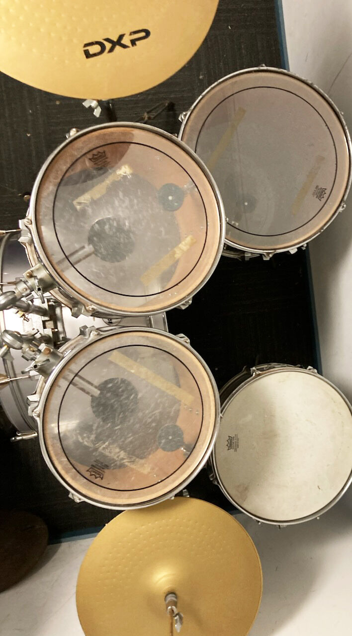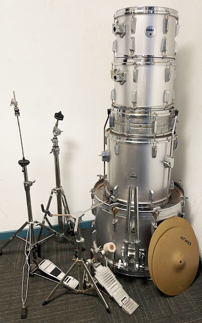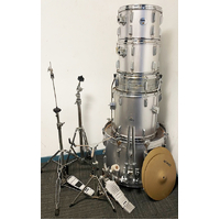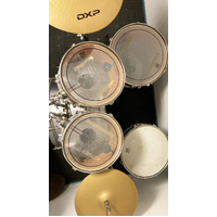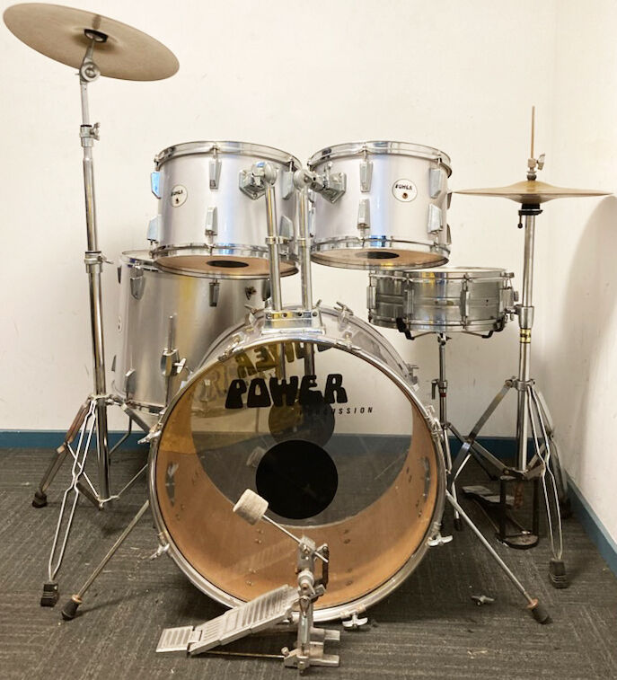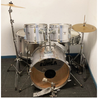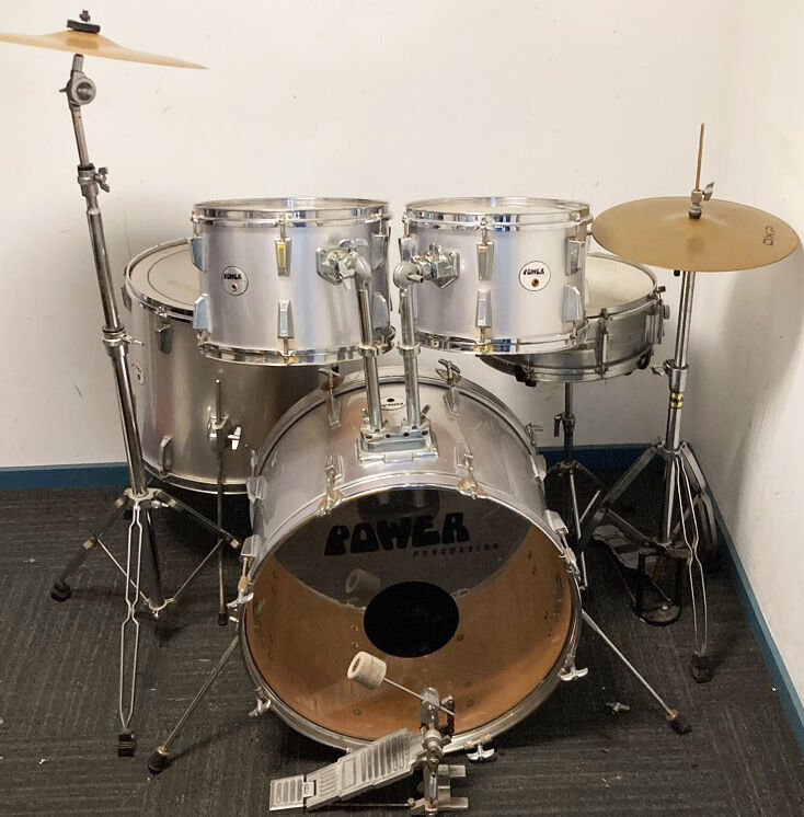Used Power Percussion 5 piece full size drum kit package including stands cymbals and stool. All our second hand drum kits are serviced and are sold with 6 months warranty for your peace of mind. This Power Percussion kit includes hi hat stand, cymbal stand, snare stand, bass drum pedal, 14" DXP hi hats, DXP crash cymbal and stool, with additional features listed below.This kit is in good condition other than some rust on the snare drum stand. The drums are in good condition with some cosmetic marks as would be expected of it's age. It has bee fully serviced and is in good working order. A reliable kit a a great price
