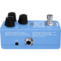Note: Plugging in the AC adapter when you Press & Hold Drum Tap switch to bootup the pedal will enter into Alt tweaking mode. The Drum Tap indicator and footswitch indicator will flash RED. Now the DRUM LEVEL knob can adjust the phones volume. You can play guitar into the pedal and tweak the DRUM LEVEL knob to adjust the phone volume. Press the footswitch to quit Alt tweaking.