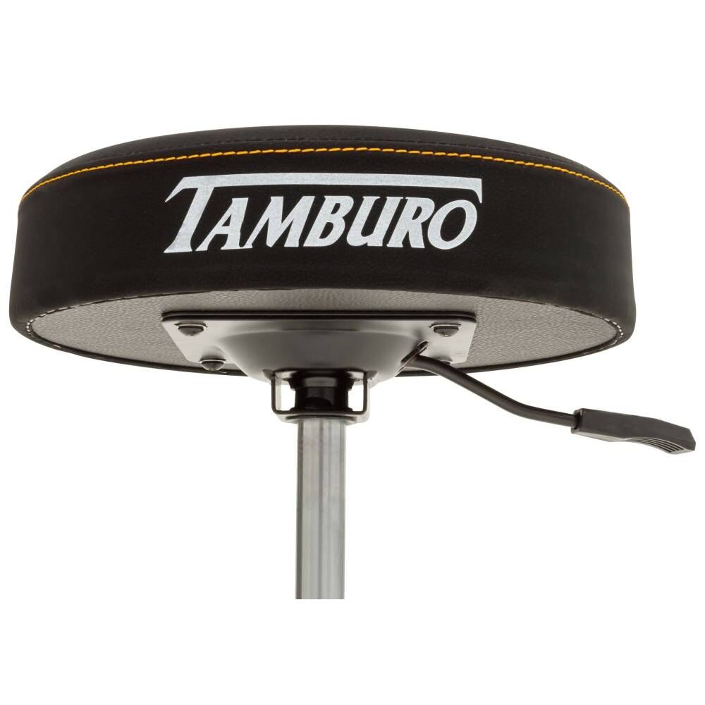 Tamburo hydraulic drum stool features a comfortable round seat, designed with an air system to ensure maximum comfort during musical performances. The “High Comfort” seat is upholstered in high-quality suede-like eco-leather, with elegant red stitching that enhances its design. Thanks to the hydraulic lever system, the stool’s height can be easily adjusted from 44 to 58 cm, allowing the drummer to find the perfect playing position.