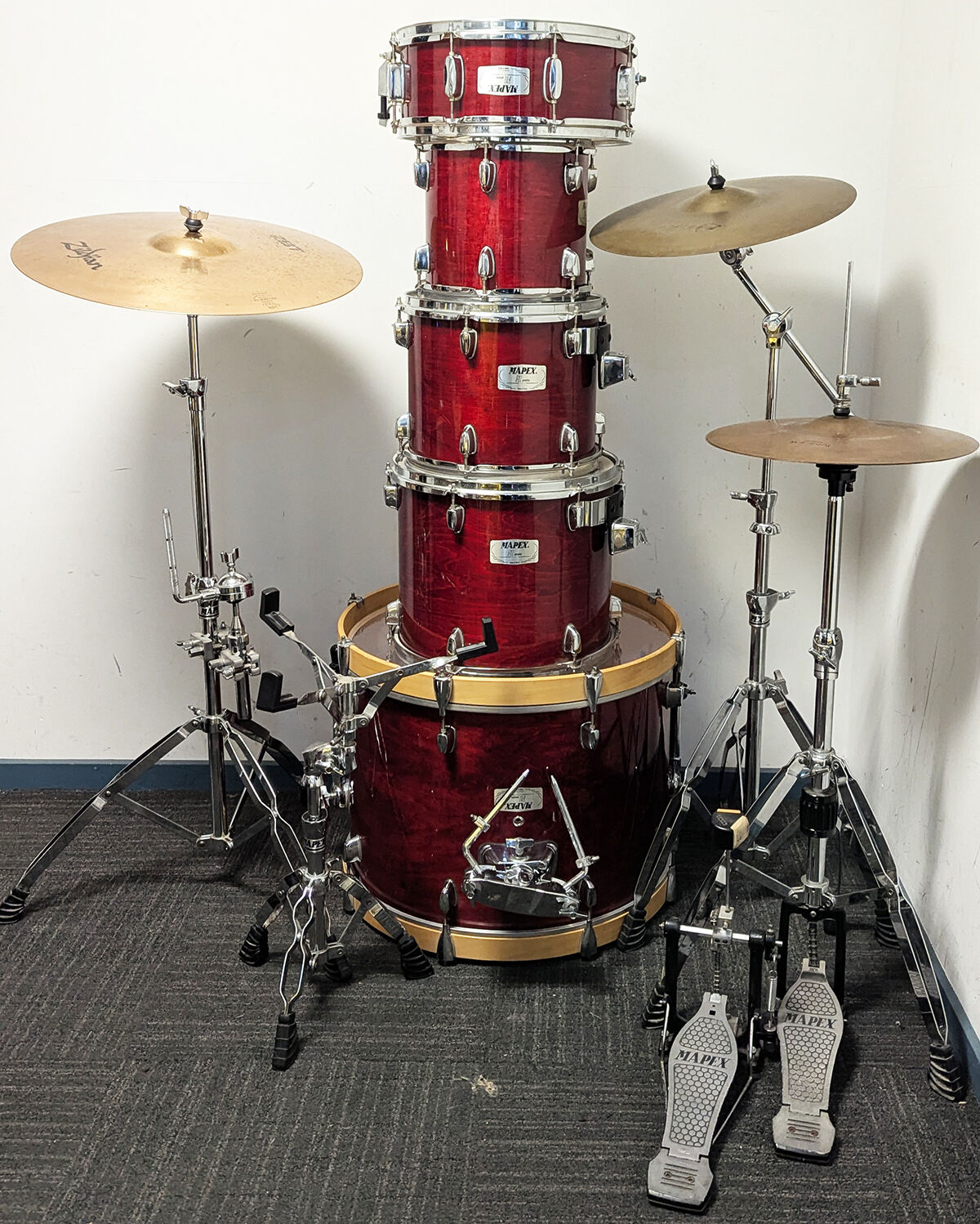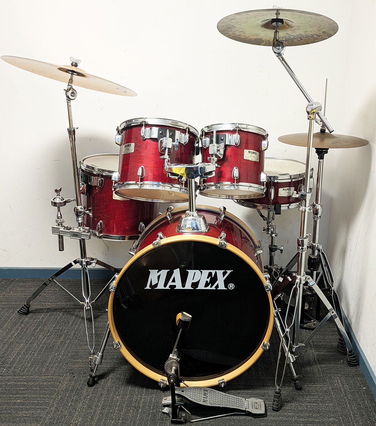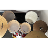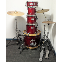 Good condition Mapex M Series birch shell woodgrain red lacquered 5 piece drum kit package including all stands, hardware. and Zildjian 14", 14", 20" cymbal set. All our second hand drum kits are serviced and are sold with 6 months warranty for your peace of mind. This Mapex M Series kit features birch shells and laqured woodgrain finish so no chance of PVC drum wrap buckling in the future and will always look great as time goes on. Birch shells deliver professional sond quality and suit all applications of live and studio use. Hardware includes all original Mapex hardware - Mapex hi hat stand, Mapex straight cymbal stand, Mapex snare stand, Mapex Bass drum pedal and Mapex boom stand. Cymbals included are 14" Zildjian Planet Z hi hats, 16" Zildjian Planet Z crash cymbal and 20" Zildjian ZBT ride cymbal. This kit is in good condition with only minor cosmetic marks on the drums. The stands are in very good condition. Drum heads include Remo clear UT tom heads, coated UT snare head and bass drum heads with control rings. Additional features listed below. It has been fully serviced and is in good working order. Great looking and sounding kit with Intermediate cymbals at a great price.