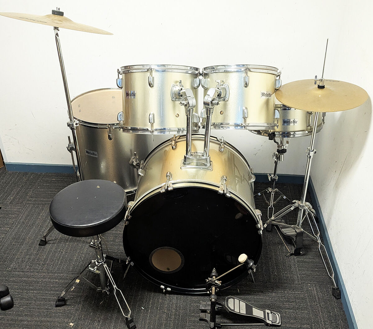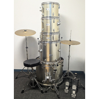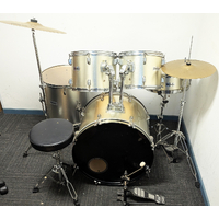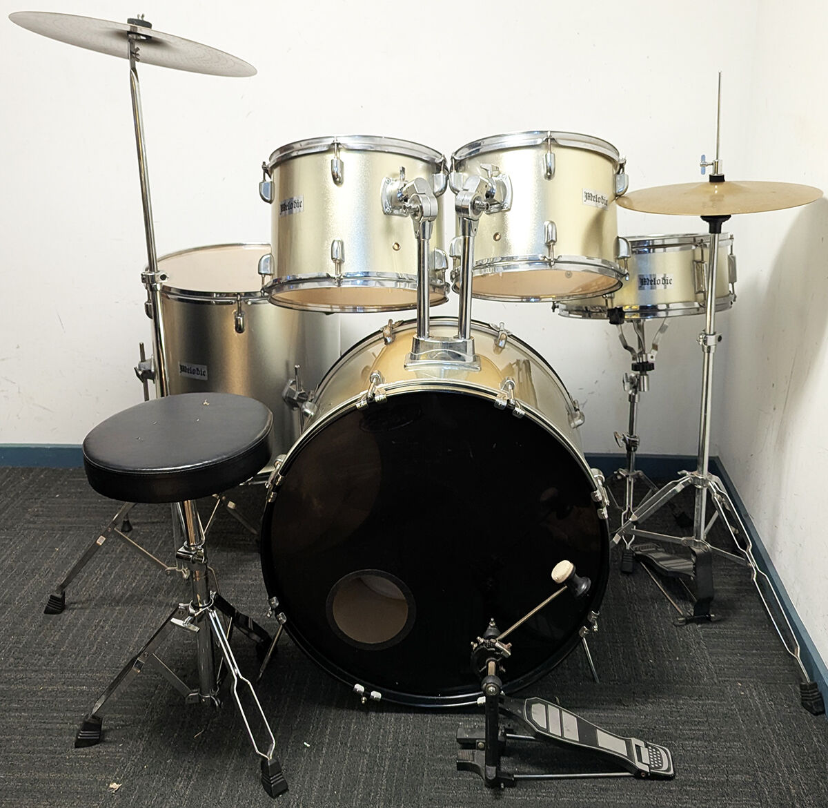 Melodic 5 piece drum kit package including stands cymbals and stool. All our second hand drum kits are serviced and are sold with 6 months warranty for your peace of mind. This Melodic kit includes hi hat stand, cymbal stand, snare stand, bass drum pedal, and stool. Cymbals included are 14" hi hats + 16" crash cymbal with additional features listed below. This kit is in good condition with a few marks on the drums. The covering is colour faded to gold on the front of the drums so it's a little gold on the front of the drums and silver on the back. This is only cosmetic and does not affect the sound or integrity of the drums. It has bee fully serviced and is in good working order. The cymbals in the first 3 photos above have been replaced with Stage hi hats, and swingstar crash (picured in 4th photo. A functional kit at a cheap price for anyone wanting to get started without breaking the budget.
