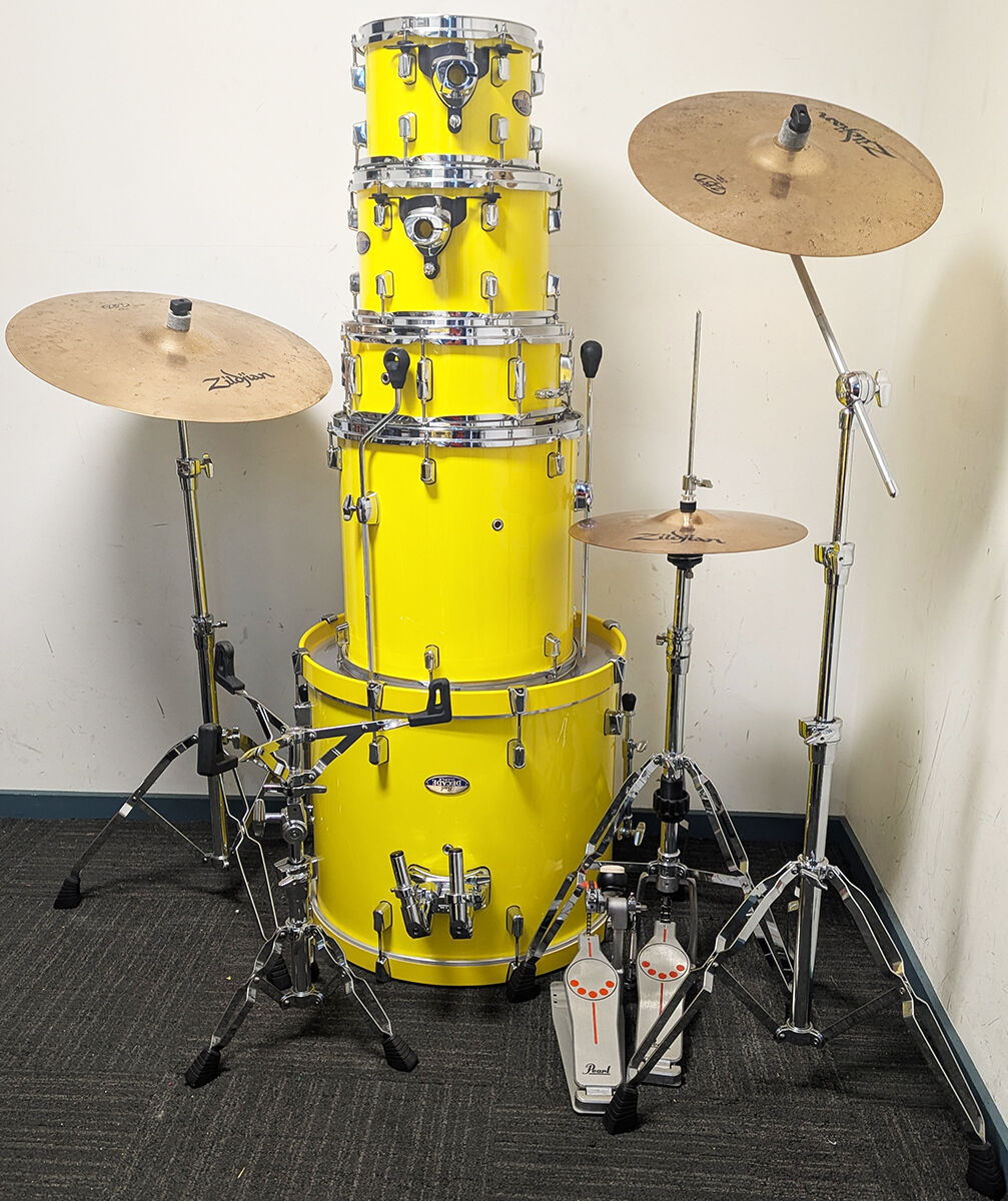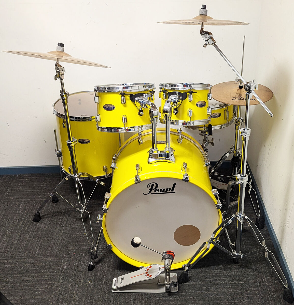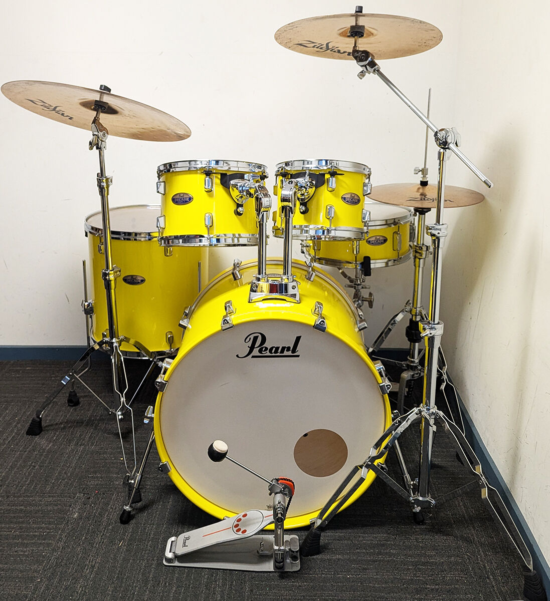 As New Pearl decade Maple 5 piece drum kit package including as new original stands and Zildjian 14", 16", 20" cymbal set. All our second hand drum kits are serviced and are sold with 6 months warranty for your peace of mind.This Pearl Decade Maple kit is in new cndition and would suit a new buyer. It has no marks at all on any drums and the stands and hardware are in new condition. It includes all maple shells and is suited for any professional application including studio recording. Includes Pearl ISS isolated suspension mounting system ensuring perfect tuning. All original hardware includes Pearl hi hat stand, snare drum stand, cymbal boom stand, straight cymbal stand and bass drum pedal. Cymbals include Zildjian ZBT 14" hi hats,16" crash cymbal and 20" ride cymbal. Origianl drum heads are in excellent condition and include clear heads on toms, bass drum heads with control rings for a fat, puchy sound and coated snare head. Additional features listed below. It has been fully serviced and is in good working order. This kit is the best condition used drum kit we have had in our used inventory and is a great opportunity for anyone looking for a new condition professional kit with all maple shells capable of any pro application and including a reliable Zildjian cymbal set at a great price.
