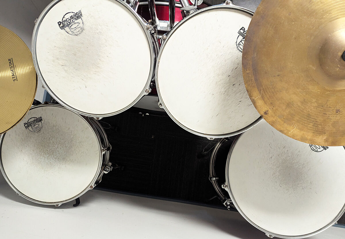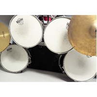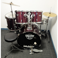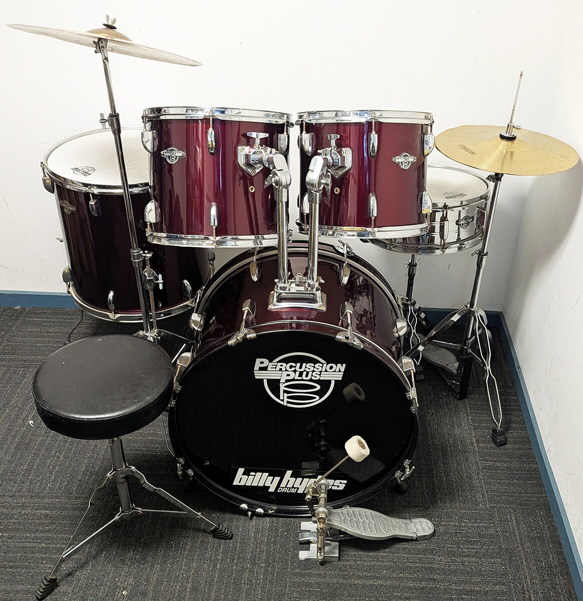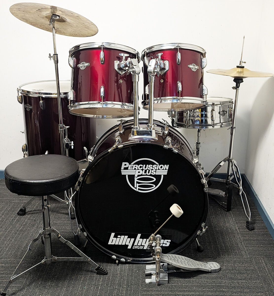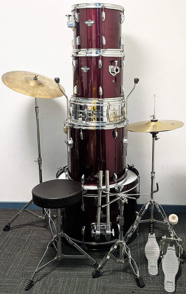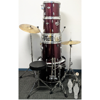 Good condition Percussion Plus 5 piece drum kit package including stands, cymbals and stool. All our second hand drum kits are serviced and are sold with 6 months warranty for your peace of mind. This kit is in good condition with only a few marks on some of the drums. It has some minimal buckling of the PVC drum covering on a couple of the drums which is not very noticable. This is cosmetic only and does not affect the sound or performance of the drum kit. Hardware includes hi hat stand, cymbal stand, snare stand, bass drum pedal, and stool. Cymbals included are entry level 14" hi hats and 16" crash cymbal. Additional features listed below. It has been fully serviced and is in good working order. The drum heads are in good condition as seen in photos. A great opportunity for someone wanting a functional drum kit to get started at a great price.