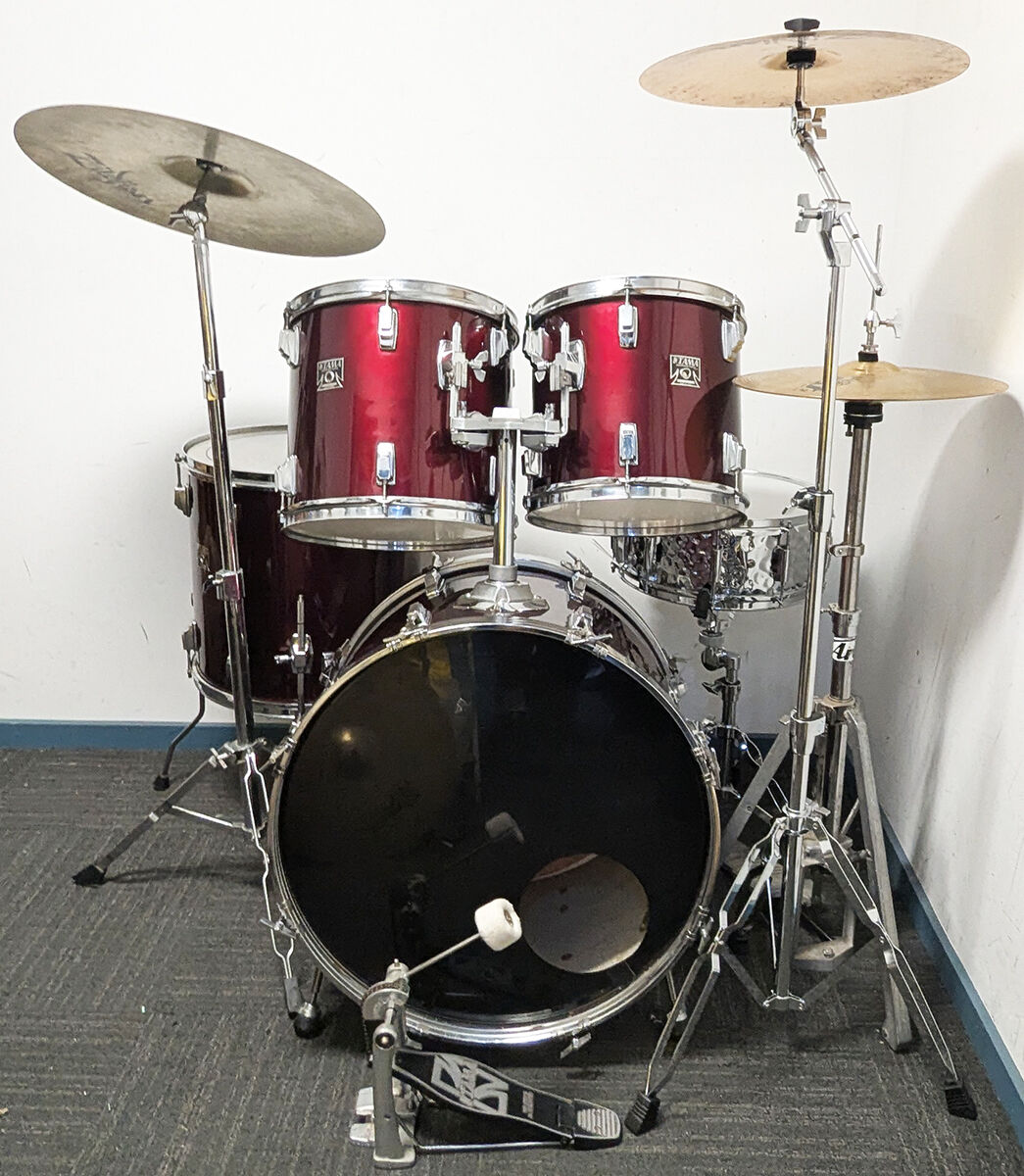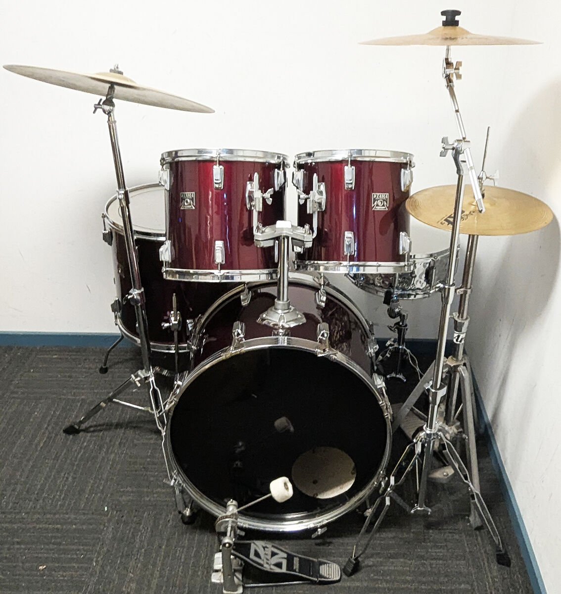 Made in Japan used Tama Swingstar 5 piece drum kit package including stands with Paiste/Zildjian 14", 16", 20" cymbal set. All our second hand drum kits are serviced and are sold with 6 months warranty for your peace of mind. This Tama Swingstar kit is in excellent condition other than a few marks on some of the drums. I has some minor scratches on the top of the bass drum from one tom touching the covering. The other drums are in excellent condition other than some minor marks. It includes a new DP Drums 14 x 6.5" hammered steel snare drum. This kit is made in Japan and is rare and collectable. Hardware includes Tama hi hat stand, Tama bass drum pedal. new DP Drums boom cymbal stand, Tama snare stand and Tama 70's straight cymbal stand. Cymbals included are Paiste PST3 14" Hi hats, Zildjian ZBT 16" crash cymbal and Zildjian Planet Z 20" ride cymbal. The hardare is in great condition. Clear Pinstripe heads on toms, new Remo coated coated snare drum head and origianal Tama coated bass drum head It has been fully serviced and is in good working order. a collectable, made in Japan solid Tama Swingstar kit with good quality intermediate cymbals at a great price.