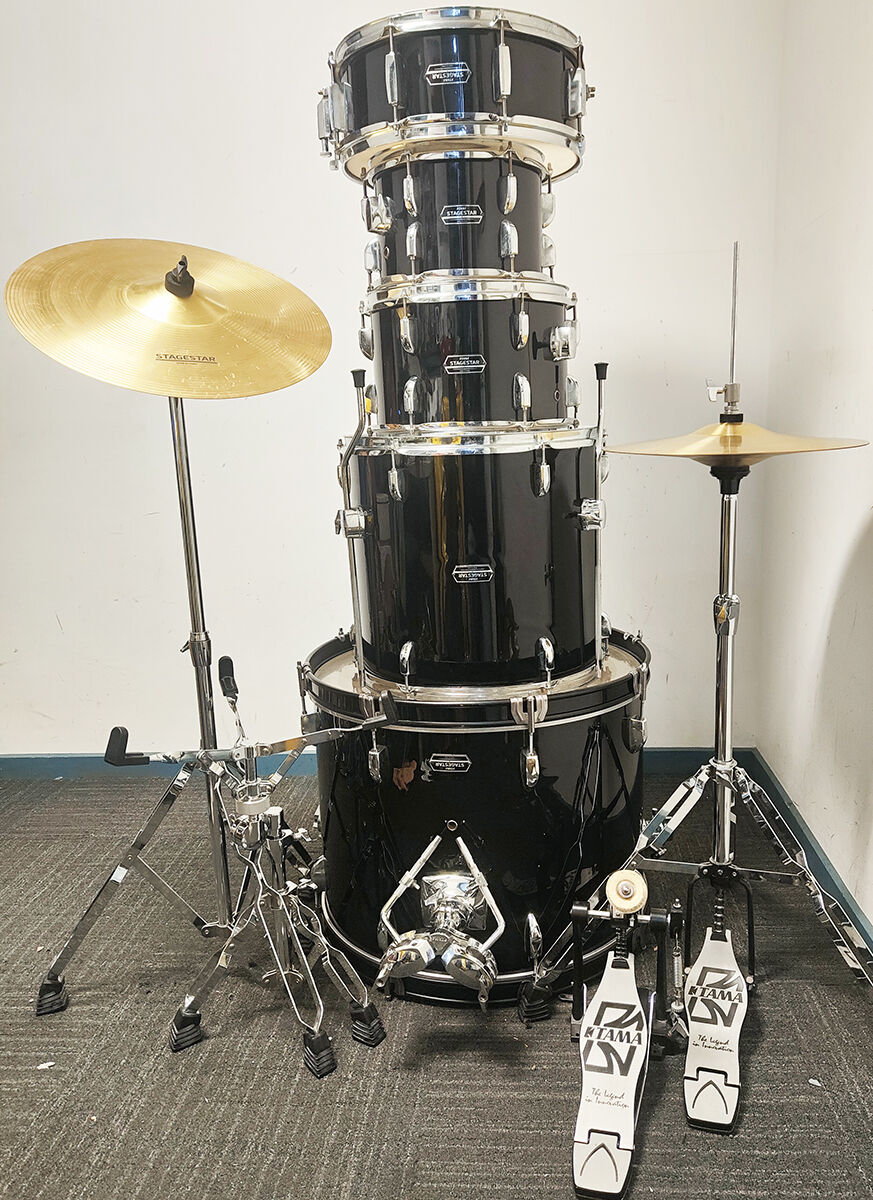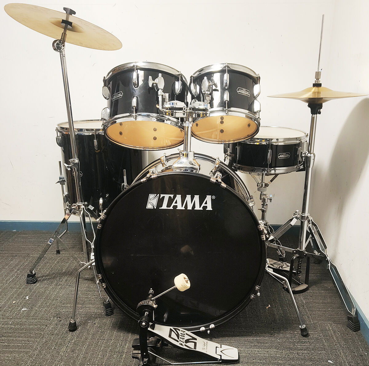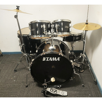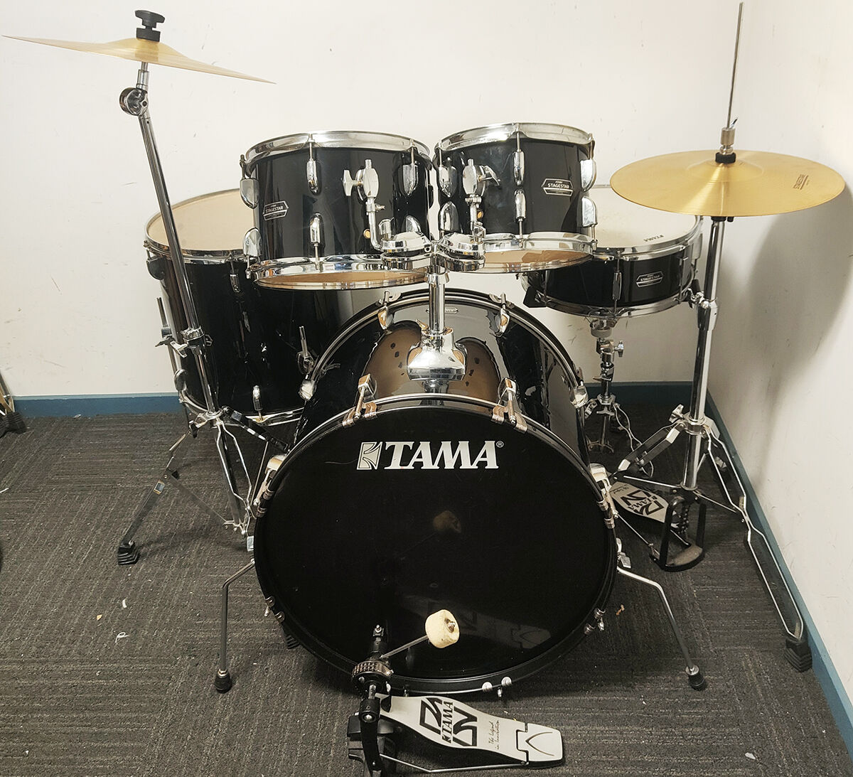 Tama Stagestar 5 piece drum kit package including stands and cymbals. All our second hand drum kits are serviced and are sold with 6 months warranty for your peace of mind. This Tama is in good condition other than some buckling of the PVC drum covering on the bass drum and small amount on the floor tom. This is cosmetic only and does not affect the sound or integrity of the drum kit. The original hardware is in excellent condition and includes hi hat stand, cymbal stand, snare stand and bass drum pedal, Cymbals Include original 14" Stagestar hi hats and 16" Stagestar crash cymbal in new condition. It has bee fully serviced and is in good working order. Additional features listed below. A great opportunity for anyone wanting a reliable, brand name kit with great hardware at the right price.